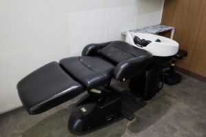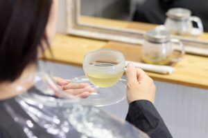 足が伸ばせる最高級のフルフラットシャンプー台、お飲み物はオーガニックハーブティー。(もちろん、苦手な方にはそれ以外も!)